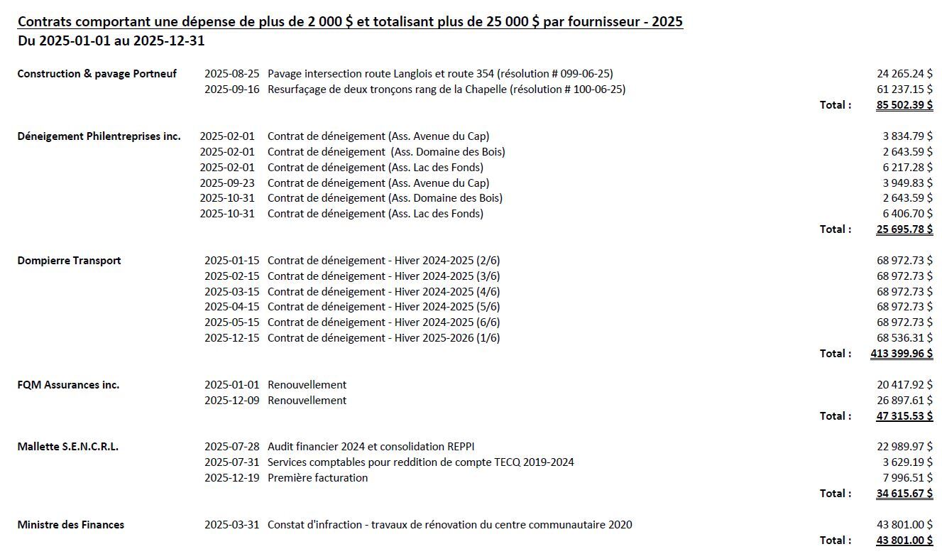 De plus, tel que requis par l’article 961.4 du Code municipal du Québec, la Municipalité publie sur son site Internet, au plus tard le 31 mars de chaque année, la liste de tous les contrats comportant une dépense de plus de 2 000 $, passés au cours du dernier exercice financier complet précédent avec un même cocontractant, lorsque l’ensemble de ces contrats comporte une dépense totale excédant 25 000 $.